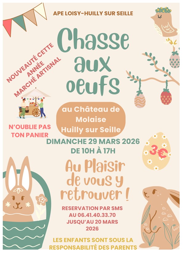 De 10h à 17h, dimanche 29 mars je serai présente dans le parc du château de Molaise à Huilly sur Seille, au sein du marché artisanal. Au programme : chasse aux œufs, vente de tartes et marché artisanal !