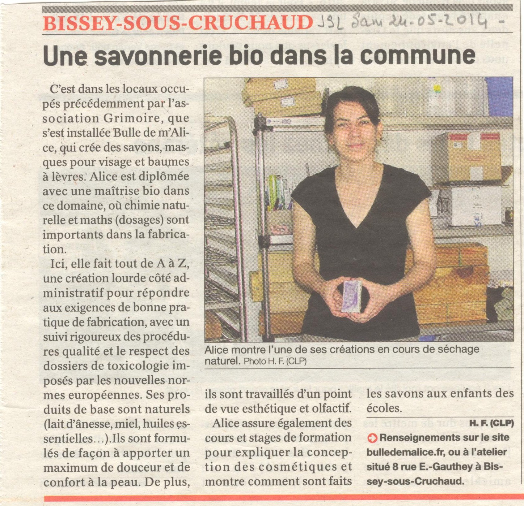 Premier article sur la savonnerie dans le jslVoici le premier article paru sur ma savonnerie (dans le jsl samedi 24/05/2014) :article sur l’ouverture de la savonnerie artisanale Bulle de m’Alice à Bissey-sous-Cruchaud Étiquettes: bissey-sous-cruchaud, bulle de m'alice, Presse, savonnerie artisanaleRead more articles Article précédentNouveau : nuage de karité coco/vanille Article suivantParticipation au marché des producteurs de la ferme de Malo (Etrigny) Vous devriez également aimer Bulle de m’Alice fait partie du réseau Ta balise 15/07/2022 Lancement de la marque Bulle de m’alice demain au Croq’nature de Chalon 21/03/2014 Article sur le marché des producteurs de Nanton « Allant vers » 10/07/2014Laisser un commentaireVous devez être connecté pour publier un commentaire.